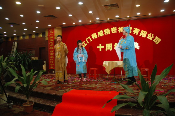2012年3月25日是江門格威精密機械有限公司成立十周年的大喜之日,為了慶祝十年廠慶,公司組織了一系列豐富多彩的慶典活動,如出公司廠報,出畫冊,制作公司發(fā)展歷程的視頻,25日晚還組織了隆重的聚餐、娛樂表演暨2011年度優(yōu)秀員工頒獎和十年老員工頒獎活動。全廠員工歡聚一堂,在大家的歡聲笑語中,在高層領(lǐng)導(dǎo)和各位同仁的觥籌交錯中,我們的慶典活動在當(dāng)晚八點鐘圓滿結(jié)束了。